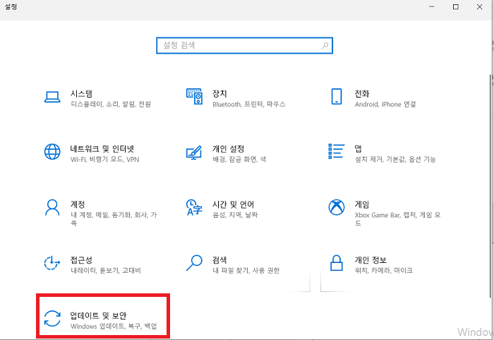 1단계: 시작 메뉴의 “설정”을 선택하고 “업데이트 및 보안”을 선택합니다.