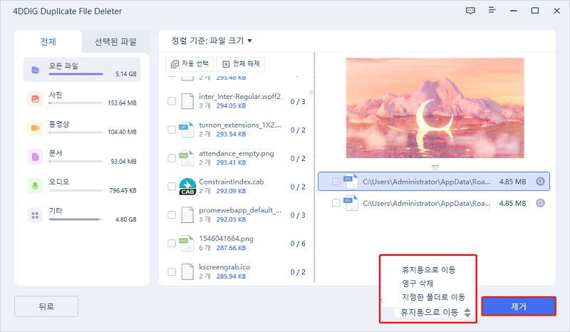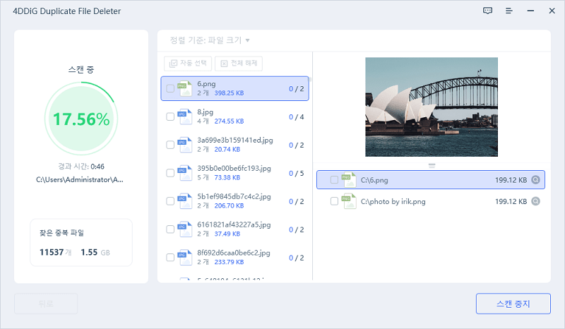 3단계: 스캔이 완료되면, 화면에 중복 파일이 표시되고, 오른쪽에서 파일 내용을 미리보기 한 뒤, 필요한 항목을 선택할 수 있습니다.