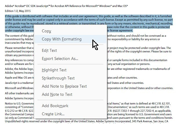 PDF에서 텍스트를 복사할 때 깨진 결과가 나오는 경우, Adobe Acrobat의 '서식 있는 텍스트로 복사' 기능을 사용해보세요. 이 도구는 텍스트 구조와 스타일을 유지하여 다른 문서에 붙여넣을 때 텍스트가 엉망으로 나타날 가능성이 줄어듭니다. 이 방법은 작은 텍스트 조각을 복사할 때 유용합니다.