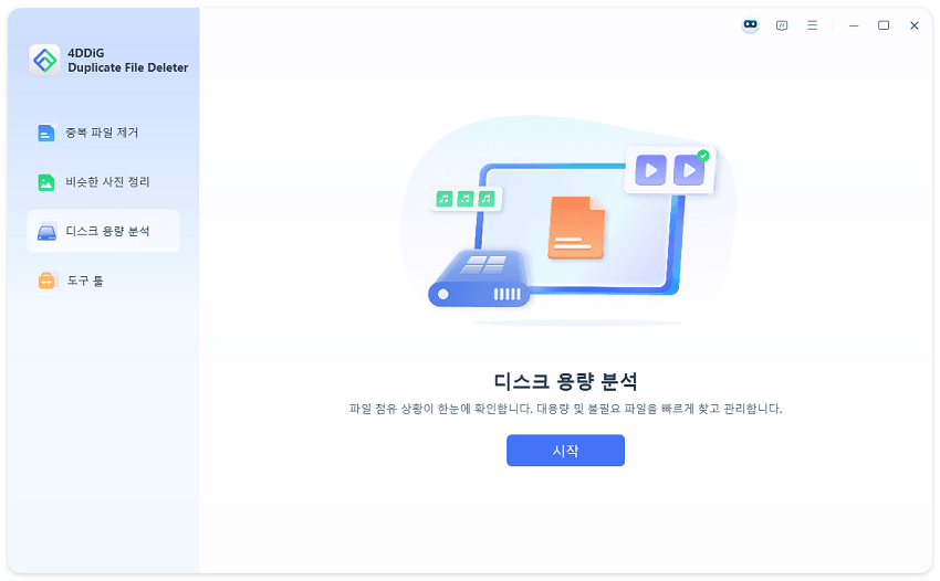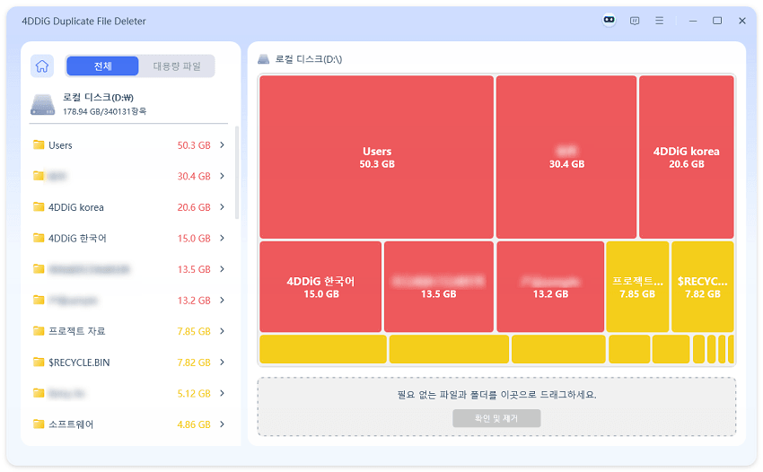 이럴 땐 4DDiG Duplicate File Deleter(4DDiG 중복 파일 삭제기)의 "디스크 용량 분석" 기능이 최적의 해결책입니다. 시각적인 분석 UI와 고속 검색 알고리즘으로, 몇 분 안에 컴퓨터의 저장 공간을 효율적으로 스캔하고 불필요한 대용량 파일을 찾아 제거할 수 있습니다.