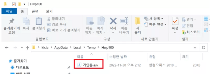 3. 복사한 경로로 이동하면 하위에 Hwp100 폴더가 있습니다. 이곳에 .asv 확장자를 가진 임시 저장 파일이 자동으로 생성됩니다.