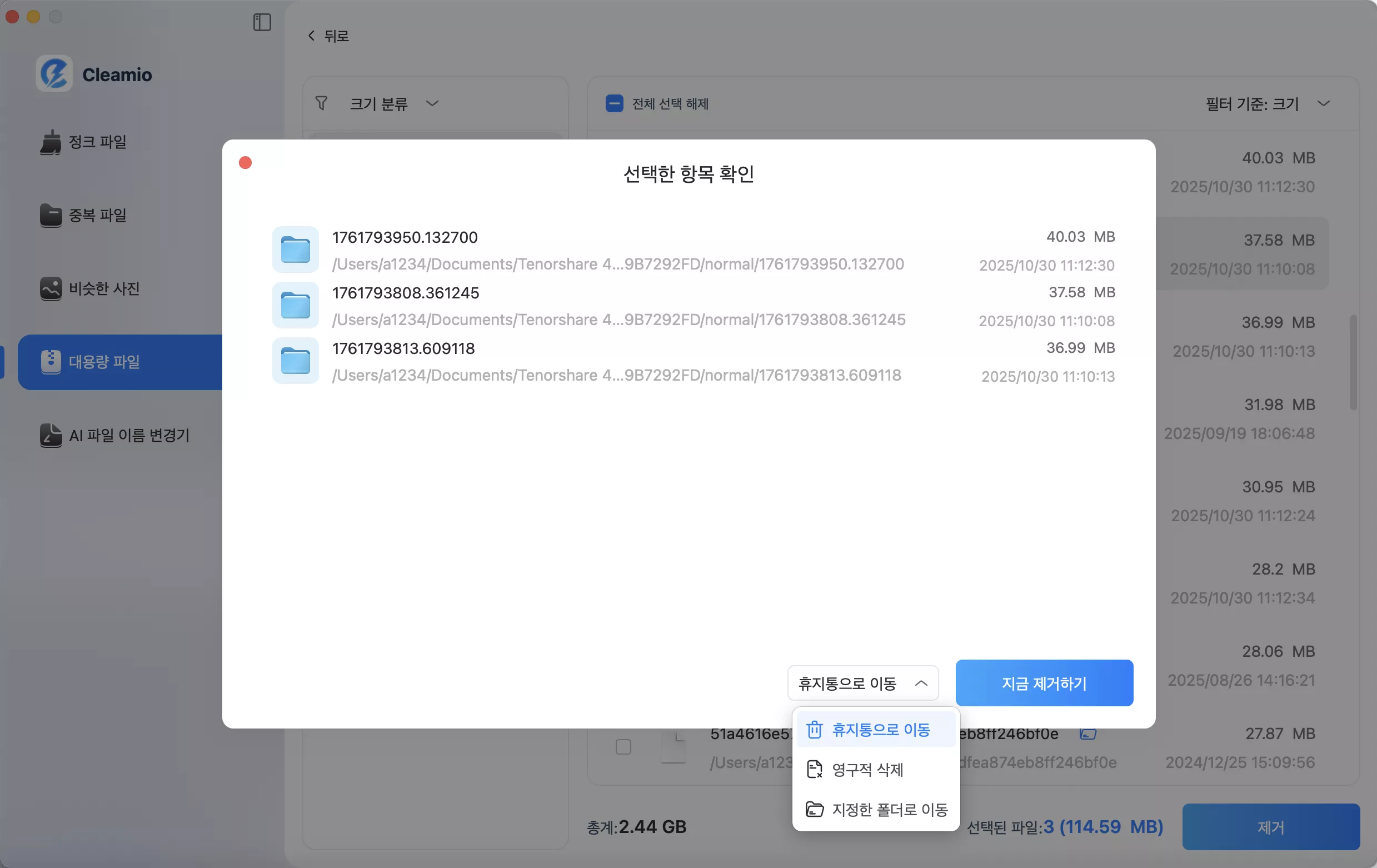 3. 대용량 파일을 이동할 방식을 선택한 다음 지금 제거하기를 클릭하세요. 삭제 여부를 묻는 팝업이 뜨면 예를 클릭해 대용량 파일 삭제를 확정합니다.