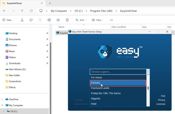 - 다음으로 easyanticheat_setup.exe를 실행하고 드롭다운 메뉴에서 게임을 선택합니다.