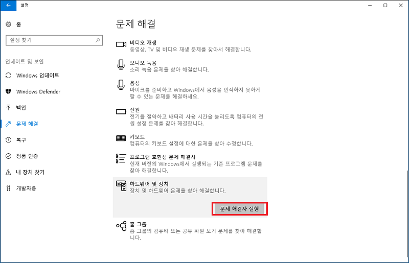 5.하드웨어 및 장치 페이지에서 "문제 해결사 실행" 버튼을 클릭합니다.