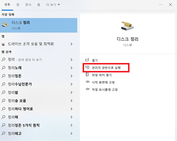 1. 윈도우 마크를 클릭하고 검색창에서 “디스크 정리”를 검색합니다. 위의 화면과 같은 화면이 표시되면 “열기”를 클릭합니다.
