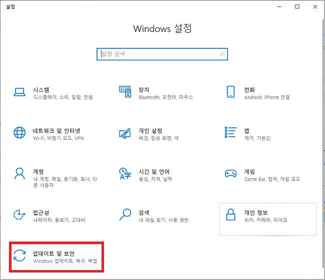- "설정"→"업데이트 및 보안" 순으로 엽니다.