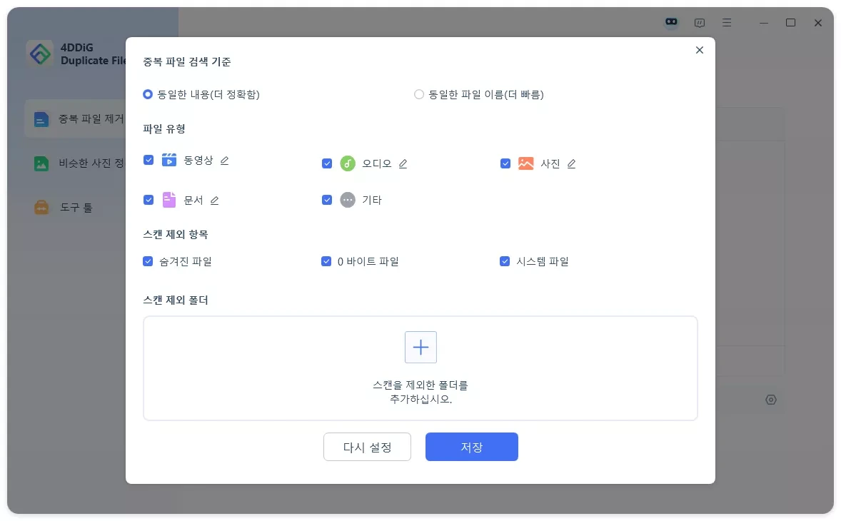 처음에는 수동으로 시작해보시고, 파일이 많다면 전용 프로그램을 활용해보세요. 개인적으로는 4DDiG Duplicate File Deleter가 가장 사용하기 편했습니다.