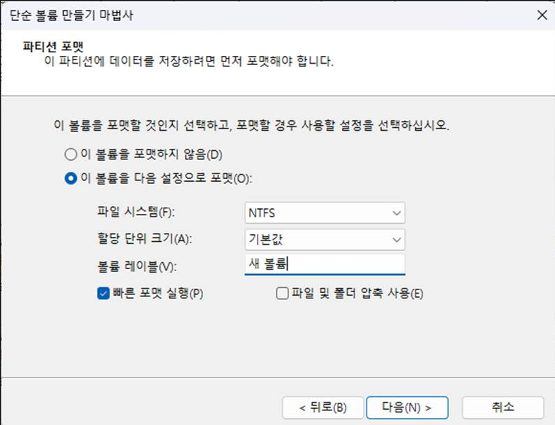 - 새 파티션을 오른쪽 클릭하고 '포맷'을 선택하세요.
