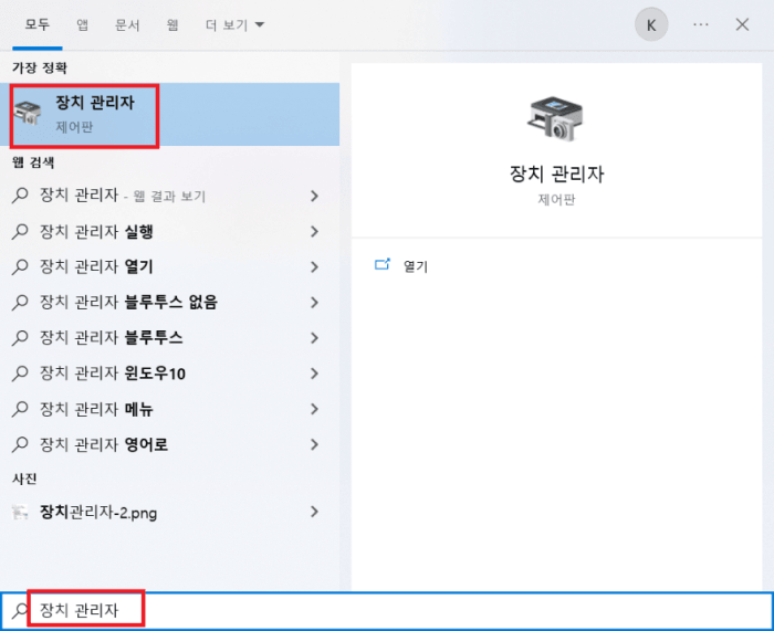 1. 작업 표시줄의 윈도우 표시를 누르고, [장치 관리자]를 검색하여 들어갑니다.